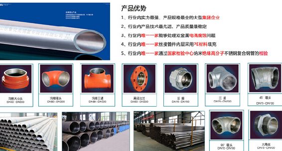 内衬不锈钢复合管件包括:可锻铸铁内衬不锈钢复合丝接管件和球墨铸铁内衬不锈钢复合沟槽管件。