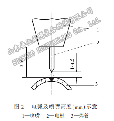 焊接时电弧的长短对加热区有直接影响。焊接内衬不锈钢薄壁焊管时,电弧长度一般适宜控制在1~1.5mm图2。这样的电弧长度使焊接过程的有效功率得到很大提高。电弧呈喇叭形状,电弧长度越短,焊缝加热的范围就越集中,由空气和管材散失的热量将明显减少。