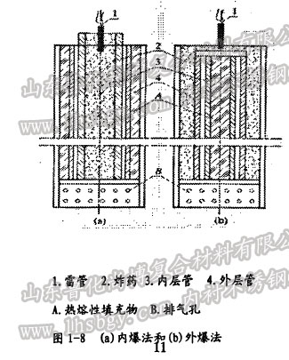 根据生产工艺的不同,双金属管的爆炸复合可用内爆法、外爆法两种工艺方法进行。