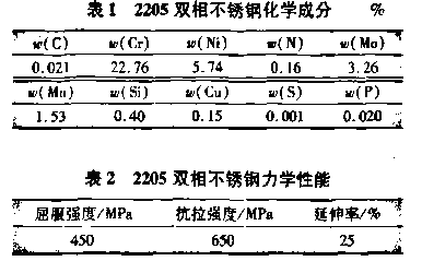 2205双相不锈钢材料执行标准为API 5LD《内覆或衬里耐腐蚀合金复合钢管规范》,采用瑞典 Avesta公司生产的2205双相不锈钢薄板,通过制管机生产2205双相不锈钢衬管,规格为Φ97mmx2mm。2205双相不锈钢的化学成分及力学性能见 表1、表2。