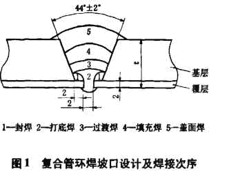 从图1中可以看出,复合管焊接工艺主要包 括封焊、打底焊、过渡焊、填充焊和盖面焊5个部 分,焊接方法采用的是手工钨极氩弧焊(TIG)和 手工电弧焊(SMAW),其中封焊和打底焊为(TIG), 其他均为(SMAW)焊接坡口角度为44。±4。,钝边长度2 ~3 mm,对焊间隙为2 mm。