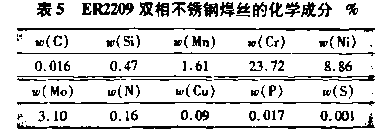 2205双相不锈钢衬层焊接材料选用原则是: 焊材比2205不锈钢w(Ni)高2%-4%,目的在于 促进焊接接头在高温下形成的铁素体转变为足够 的奥氏体组织,确保焊缝中奥氏体相占优势。 因此,封焊和打底焊采用的是ER2209焊丝,直径 0.9mm。ER2209不锈钢焊丝的化学成分见表5。
