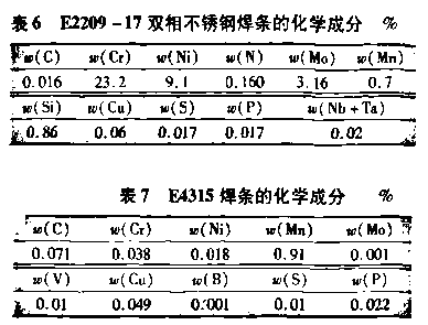 在20钢基管焊接的焊材选择上,普通碳钢管 的焊接作为成熟的焊接工艺,采用E4315焊条焊 接即可。但是,基于2205双相内衬不锈钢复合管焊接 工艺的选择,我们选择了不同的焊接材料进行基 管焊接试验:E2209 - 17双相不锈钢低氢焊条和 E4315低氢型焊条,规格分别为Φ2.5mm 和Φ3.2mm。E2209 -17和E4315焊条的化学成 分如表6、表7所示。