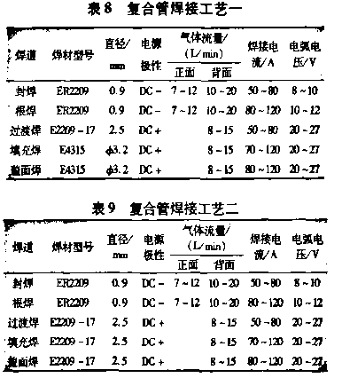 上述是整个复合管环焊的工艺规范。本试验 采用两种焊接工艺,工艺参数分别见表8和表9,表 中DC-表示钨极接负,DC+表示焊条接正。