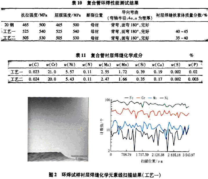 对环焊试样衬层焊缝进行X射线探伤的结 果为I级合格,力学性能测试结果见表10,复合管 衬层焊缝化学成分见表11,焊接工艺一的衬层焊 缝主要合金元素线扫描结果如图2所示,焊接工 艺二的复合管焊缝金相组织如图3所示。